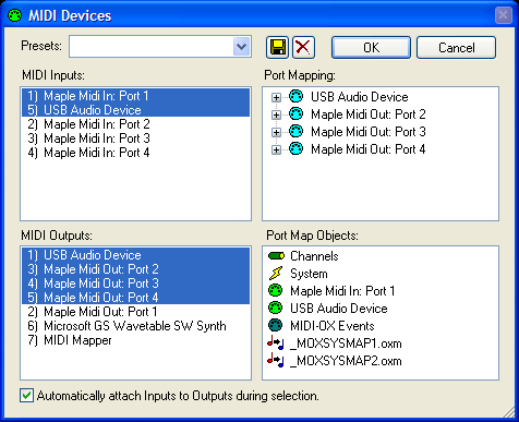 6. Run MCT. Go to Options->Configure... and select 'Maple Midi In: Port 2' as Input an 'Maple Midi Out: Port 1' as Output and click Apply.